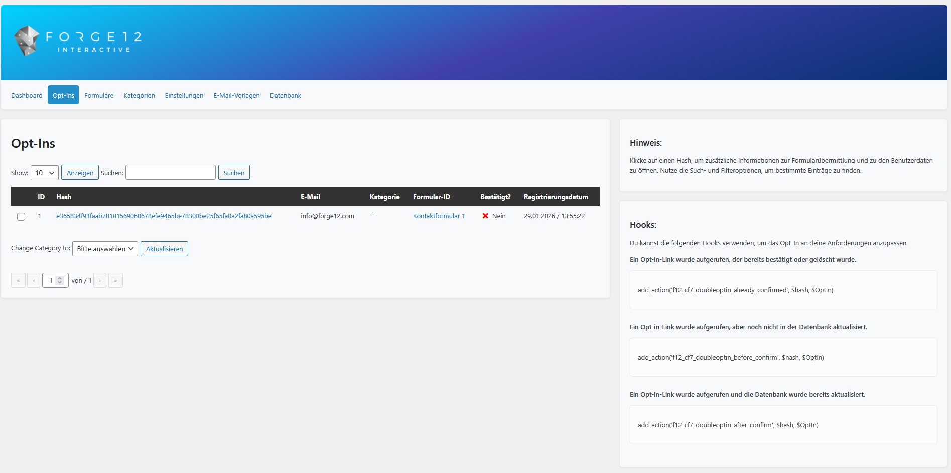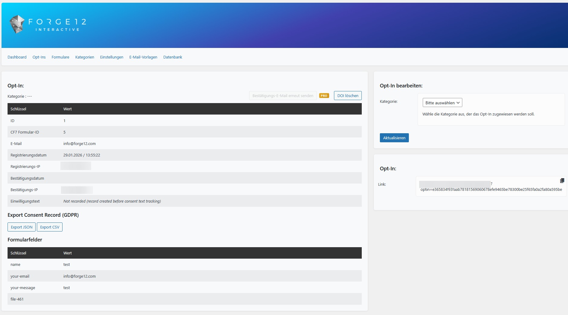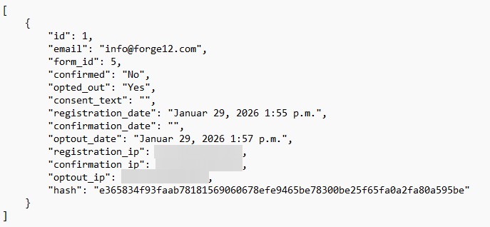 - GDPR-ready data storage (Form ID, Email, Registration/Confirmation Date & IP)