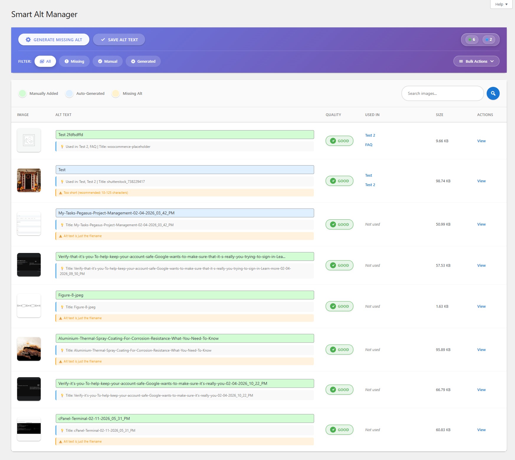 - Smart Filters – Quick filter chips to view all, missing, manual, or generated alt text